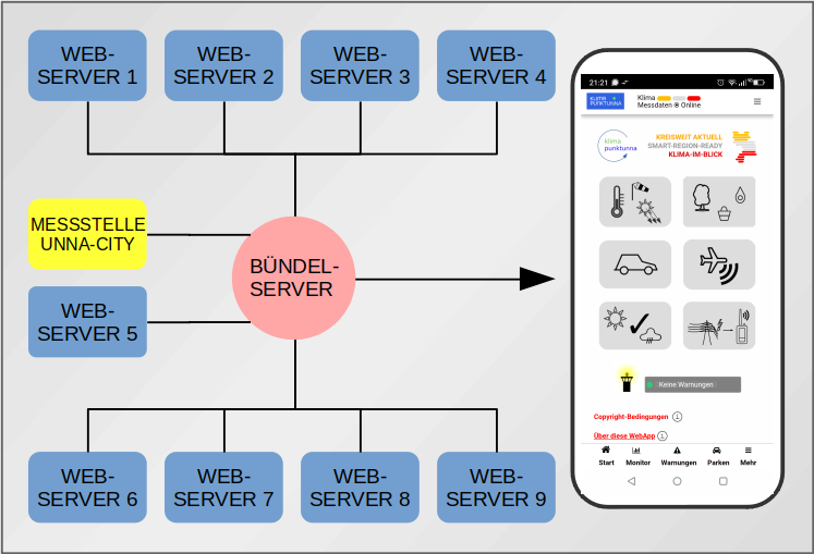 Zur Zeit liefern neun Webserver aus der Region die Basisdaten für die KLIMAPORTAL UNNA - WebApp. Hinzu kommen die Temperaturmesswerte der Messsstelle Unna-City, die über WLAN angebunden ist.