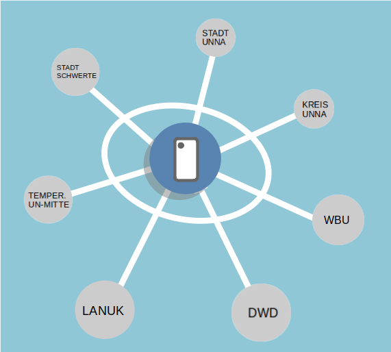 Zur Zeit liefern neun Webserver aus der Region die Basisdaten für die Klimacockpit Unna - WebApp. Hinzu kommen die Temperaturmesswerte der Messsstelle Unna-City, die über WLAN angebunden ist.