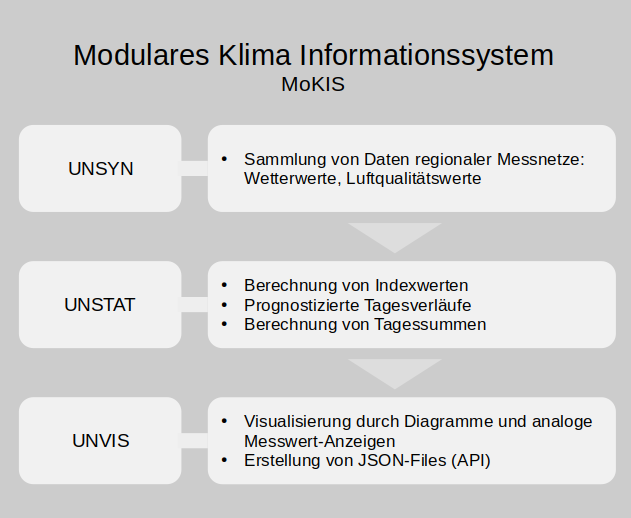 Das Modul UNSYN dient der synoptischen Erfassung der Wetter- und Klimadaten der regional verfügbaren Netze. Die Auswertung erfolgt im Modul UNSTAT, das weiterführende Informationen aus den Rohdaten berechnet. Letztlich sichtbar werden die Ergebnisse durch das Modul UNVIS, das die Visualisierung der berechneten Kennwerte vornimmt.