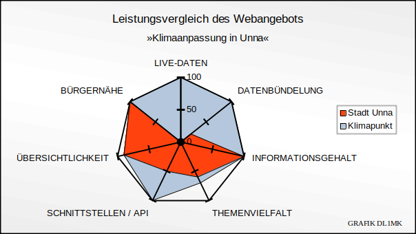Ein Vergleich der Webangebote der Stadt Unna und des Klimapunkts Unna zeigt in den Bereichen "Bürgernähe", "Informationsgehalt" und "Übersichtlichkeit" annähernd gleich hohe Leistungen. Wesentliche Unterschiede ergeben sich im Live-Angebot von klimarelevanten Informationen sowie bei den API-Schnittstellen zur Weitergabe von Daten (letztere sind in Hinblick auf die Smart Region Unna bedeutsam).