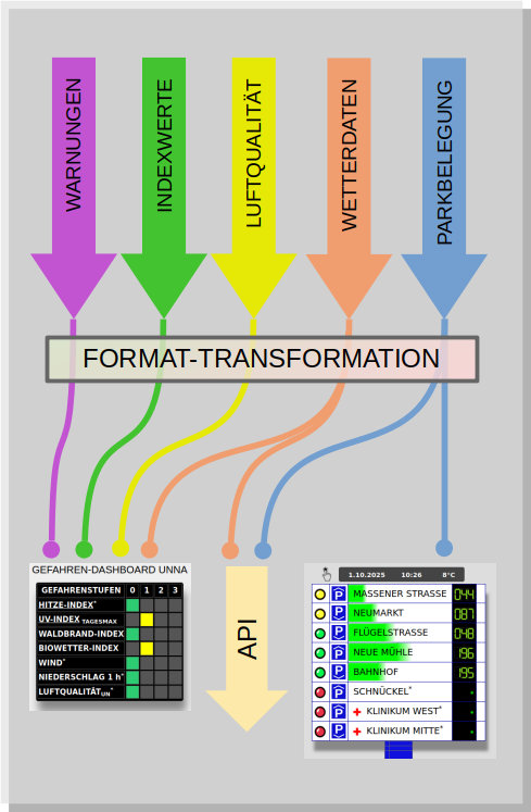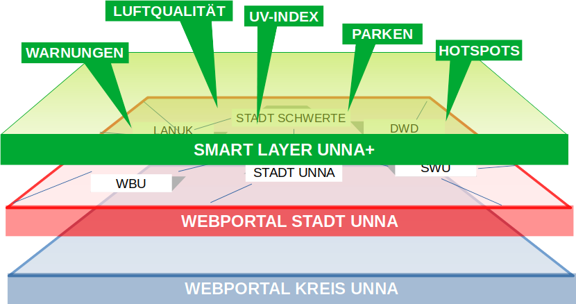 Voraussetzung zum raschen Aufbau einer Smart Region Unna sind offene Datenquellen mit standardisierten API-Schnittstellen für den interkommunalen Austausch. Zur Zeit (Januar 2026) sind nur der DWD und das LANUK auf die Weitergabe von Messdaten vorbereitet.